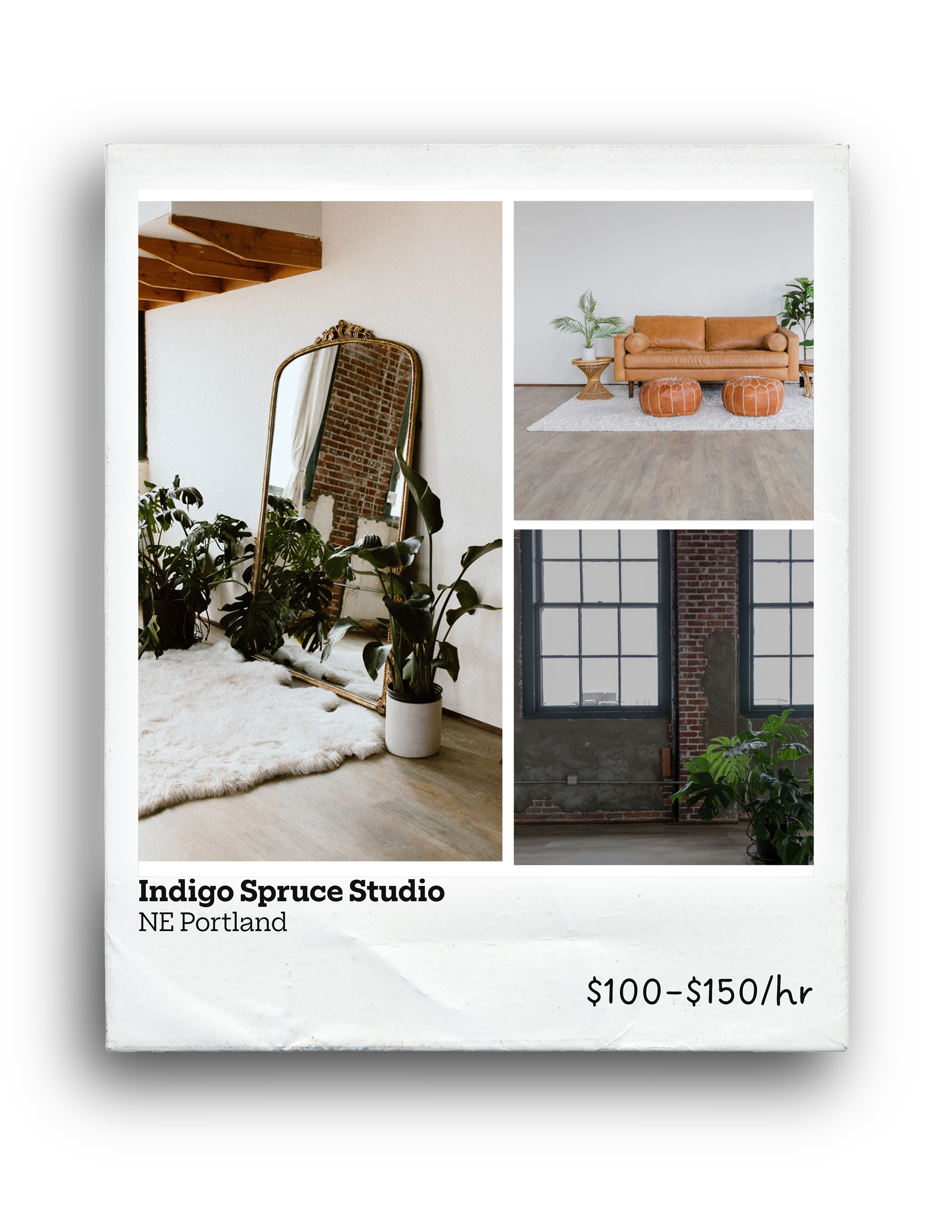 Bright, airy studio with natural light, exposed brick, and moveable furniture.